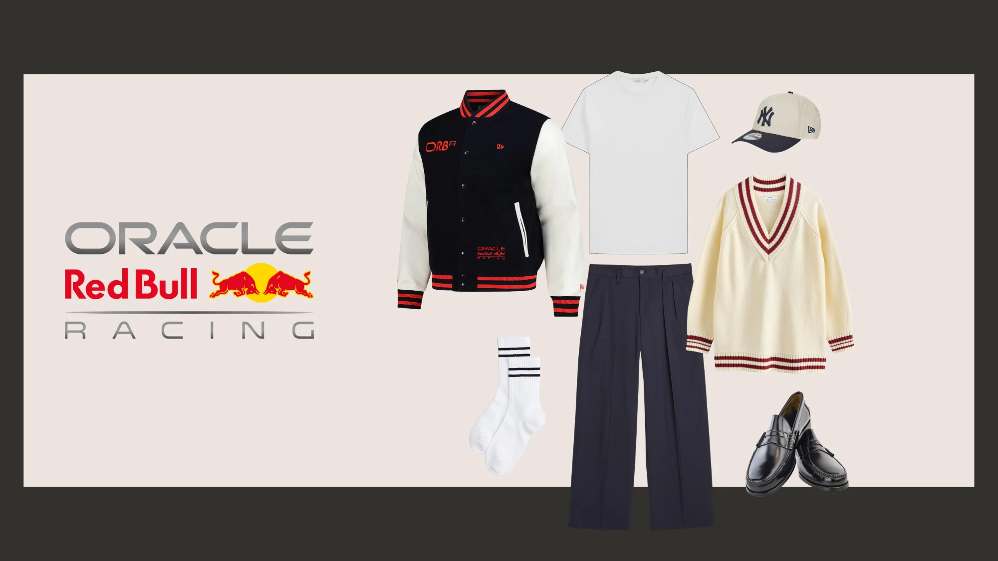 The Red Bull varsity jacket brings instant energy with its navy body and white sleeves accented by red striping. Balance its sporty vibe by layering it over a cream cricket-style jumper with complementary red trim, then pair it with wide-leg navy trousers.