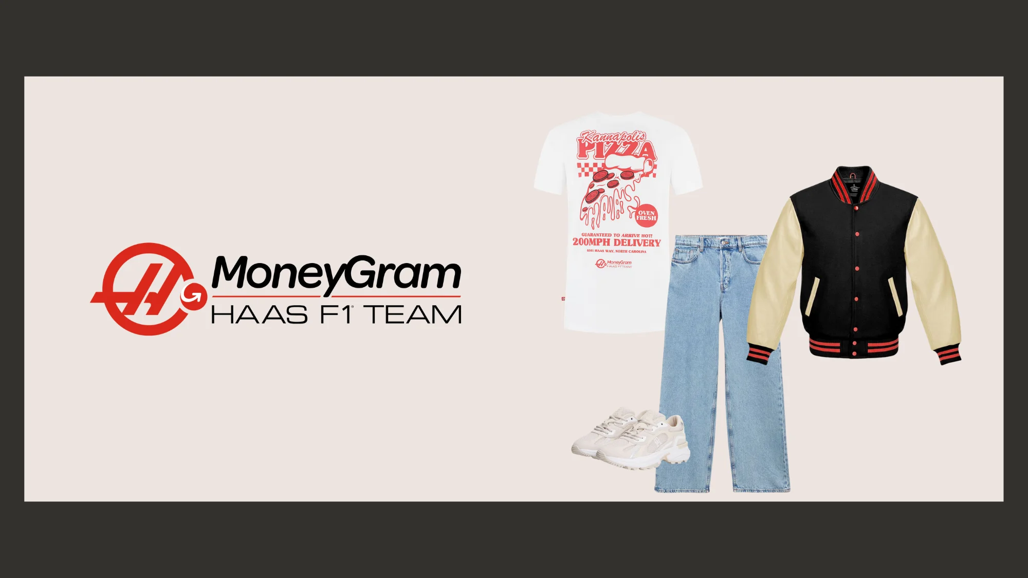 The Haas pizza graphic tee brings a playful twist to team merch. Its red and white design is unmistakably Haas while showcasing the team's fun side. Balance the bold graphic with a classic black and cream varsity jacket that picks up the red accents, keeping the focus on the tee while adding structure to the outfit.