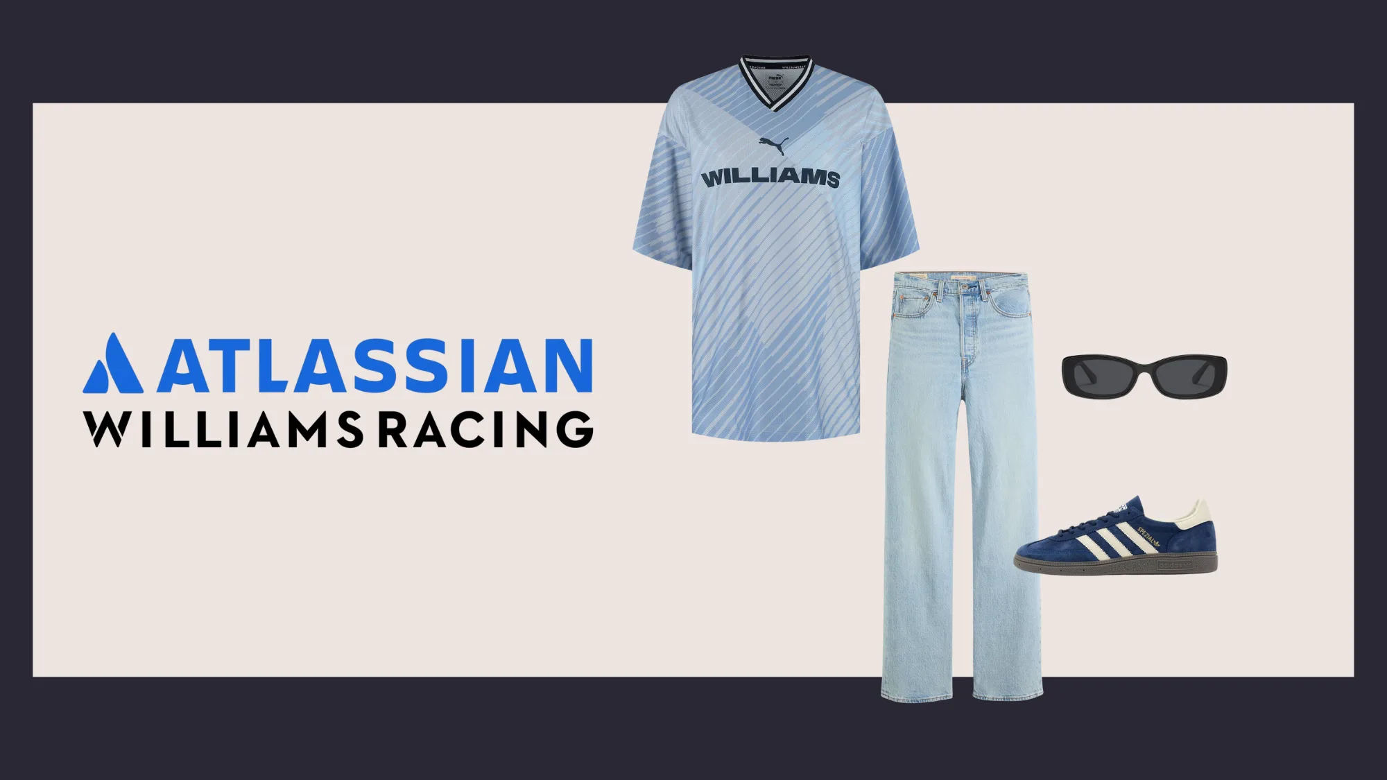 The vintage Williams jersey channels throwback football style with its geometric blue and white pattern. Lean into that retro aesthetic with light-wash wide-leg jeans and navy suede trainers. A pair of black sunglasses completes the '90s-inspired vibe.