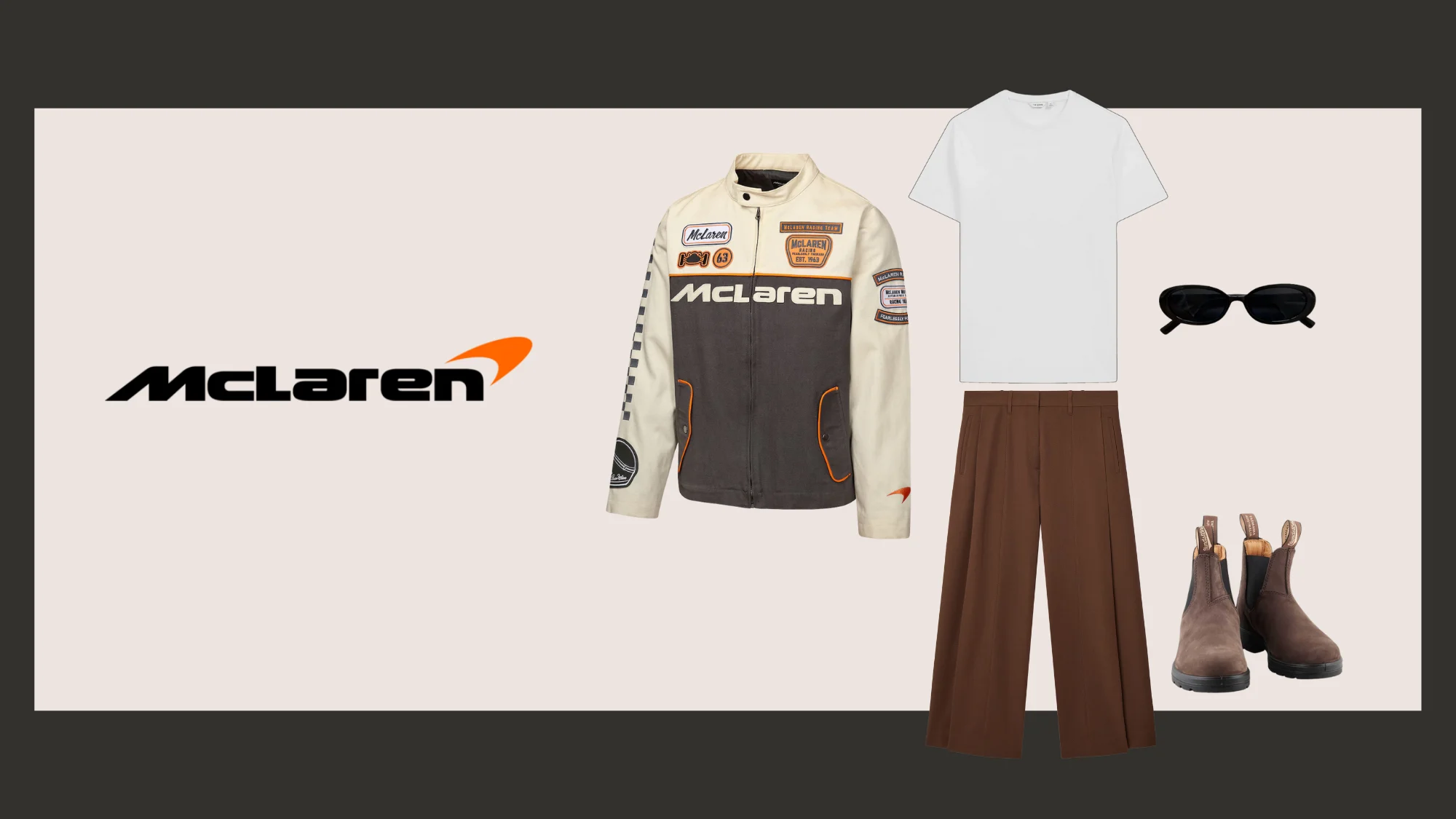 The vintage-inspired McLaren racing jacket tells a story with its cream and charcoal colour blocking and classic sponsor patches. Let it be the hero piece by keeping everything else simple: a white crew-neck tee underneath, a pair of wide-leg brown trousers, and tan boots. Black sunglasses add polish.
