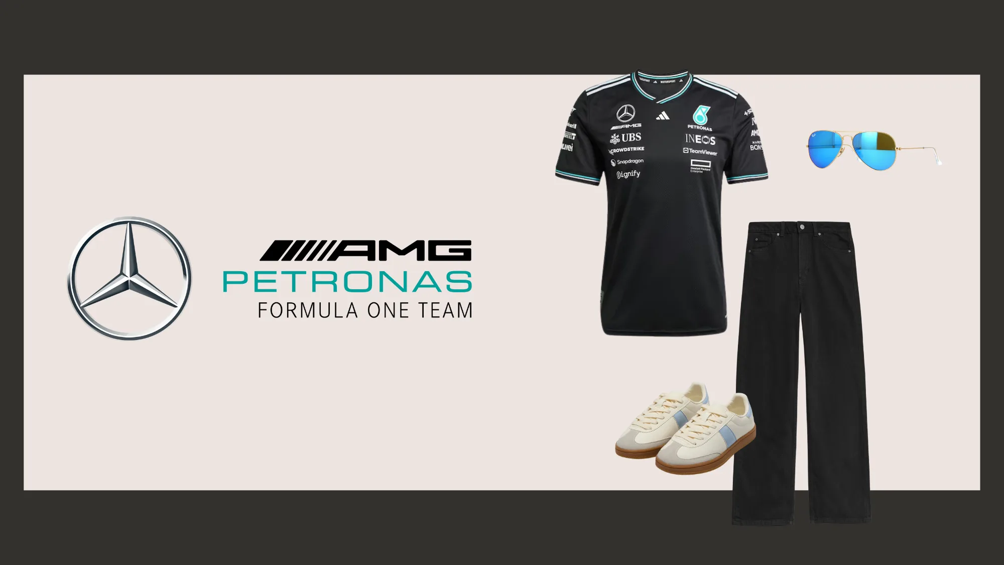 The Mercedes team polo brings racing pedigree in black with teal trim – a colour combination that feels modern and sophisticated. Ground it with black wide-leg jeans, cream trainers and pale blue and silver details that echo the team's palette. Blue aviator sunglasses add a premium touch.