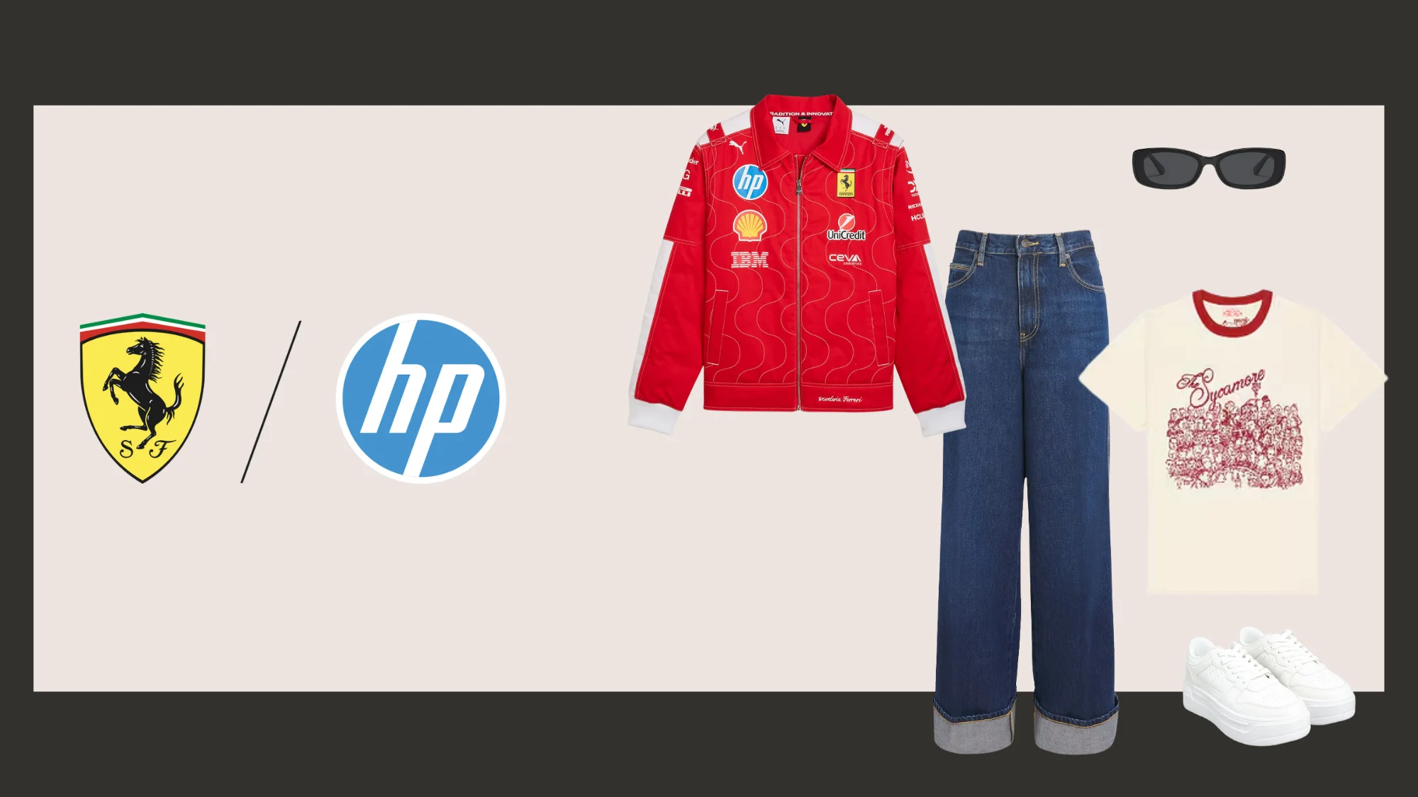 The iconic 2025 Monza Ferrari racing jacket in Rosso Corsa red demands attention, so let it shine. Layer it over a cream graphic tee with red detailing and pair it with dark-wash wide-leg jeans rolled at the hem. White platform trainers and black rectangular sunglasses keep the look balanced and modern.