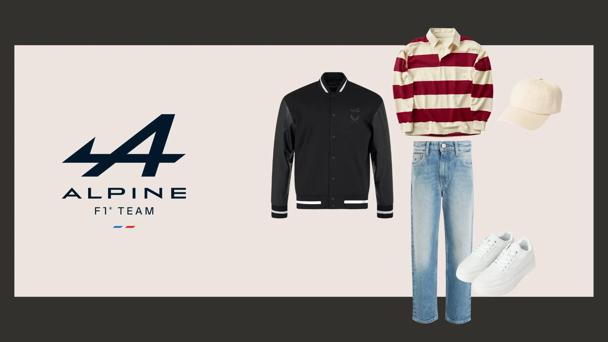 The Alpine bomber jacket in black with white trim offers a more subtle entry point to team style. Layer it over a red and cream rugby shirt – a nod to Alpine’s French roots – light-wash straight-leg jeans, and white trainers. A cream baseball cap ties everything together.