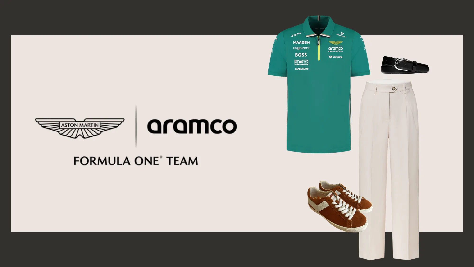 The Aston Martin team polo in signature British Racing Green is inherently sophisticated. Elevate it further with cream wide-leg tailored trousers, tan and cream trainers, and a black leather belt.